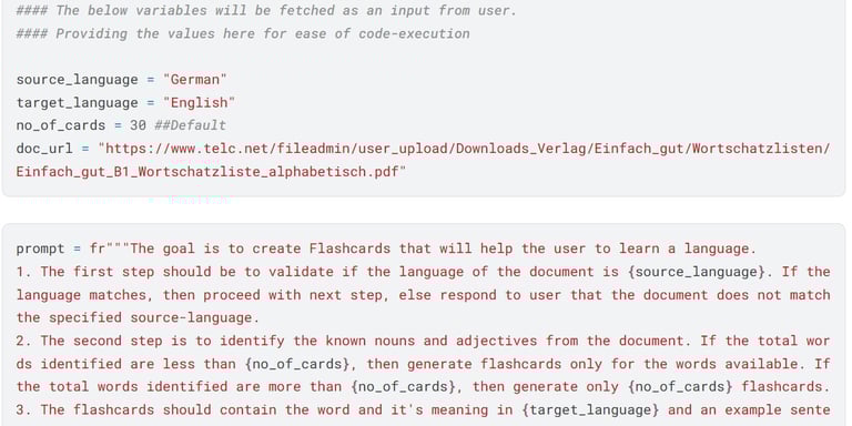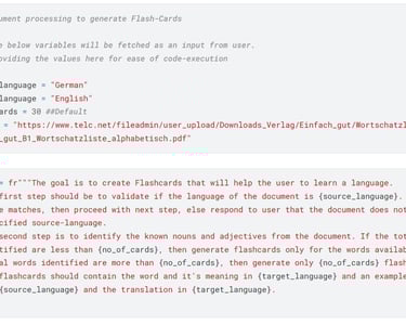 User inputs are fetched to determine the user's goal. Variables like source-language, target-language, number of flashcards are set even before the API call is made. This is to avoid ambiguity and prevent the model from assuming user's requirement. If the document or video matches the user's request, then the code proceeds with the flash-card generation, if not the API returns a message that the request does not match the input.